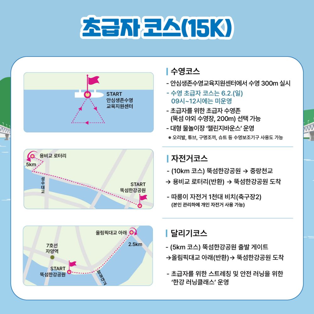 제1회 쉬엄쉬엄 한강 3종 축제는 개인의 체력 수준에 맞춰 자유롭게 참여할 수 있는 생활체육 행사입니다