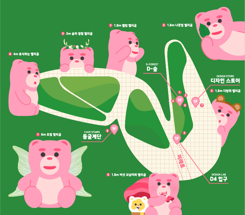 DDP 안에 위치한 B-Forest에 다양한 벨리곰들이 모여있다. 요정 벨리곰, 숲의 정령 벨리곰, 다람쥐 벨리곰...